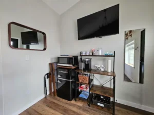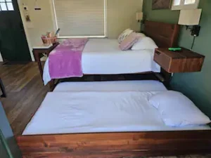 The focal point of the Lavender Room is the luxurious Black Walnut queen-sized trundle bed, fitted with premium linens and plush pillows to guarantee a restful night’s sleep.